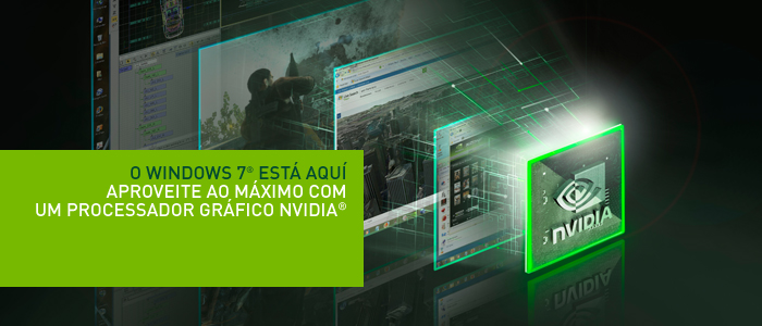 | Garanta que seu PC estará pronto para o lançamento extremamente antecipado do Windows 7 - o próximo sistema operacional da Microsoft – com um processador gráfico NVIDIA® ION™, NVIDIA® GeForce® ou NVIDIA® Quadro®1 instalado em seu sistema. Projetado para aproveitar todos os novos e incríveis recursos do Windows 7, as GPUs NVIDIA promoverão uma experiência impressionante e visualmente superior em sistemas desktop e notebook. |